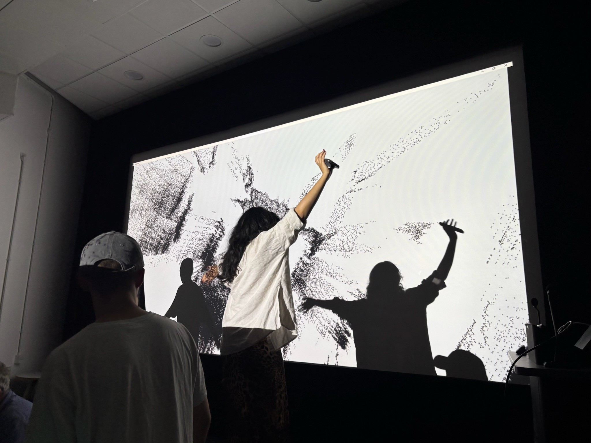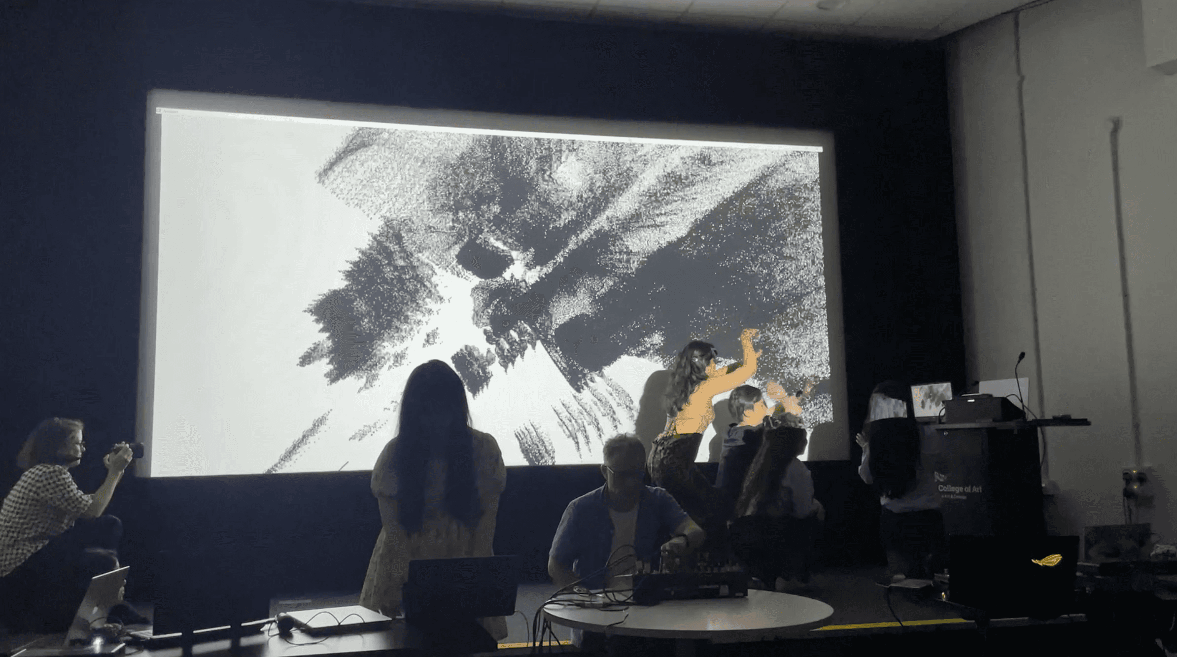 Body tracking was used to capture audience movement, allowing the visuals and sound to respond dynamically to presence and gesture. This created a feedback loop between the participant and the system, where even subtle movement could shift the environment.